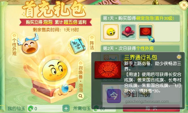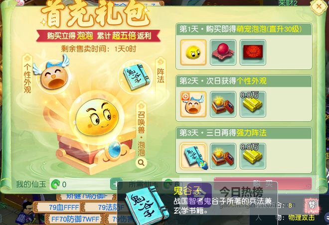 很多少侠在畅玩服冲新区的时候,都会购买首冲礼包,60仙玉就可以获得3技能泡泡,合成旗、九转金丹、储备金和阵法书,非常适合前期冲级,性价比非常高。