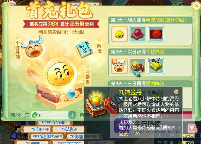 首冲礼包第2天的奖励主要是辅助角色提升,九转金丹提升修炼经验,储备金用于学习技能。