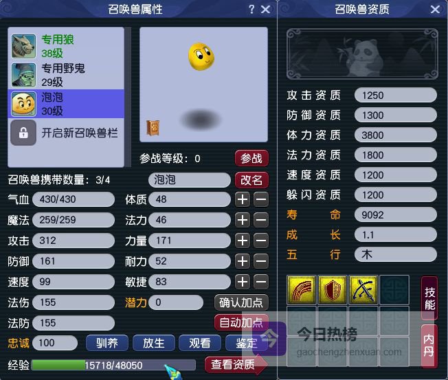 3技能泡泡作为前期过度的召唤兽也不错,如果有其他更好的召唤兽,也可以摆摊出售,或者留着以后炼妖。价值来说,这里姑且算5万。