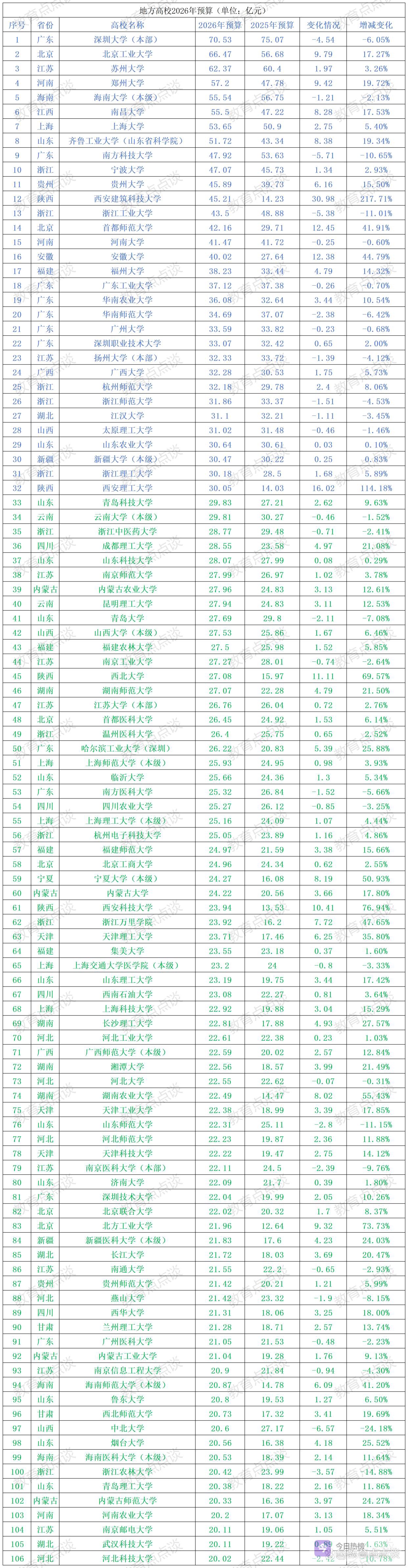 各省教育厅、地方高校陆续公布2026年经费预算。截至目前,小编统计了773所地方高校的2026年经费预算,2026年预算超过10亿的地方高校有314所,其中预算超过40亿的高校有16所,深圳大学以70.53亿居首,北京工业大学66.47亿列第2位、苏州大学62.37亿列第3位,郑州大学57.2亿列第4位、海南大学55.54亿列第5位,南昌大学55.5亿列第6位、上海大学53.65亿列第7位,齐鲁工业大学(山东省科学院)51.72亿列第8位、南方 科技大学47.92亿列第9位、宁波大学47.07亿列第10位。