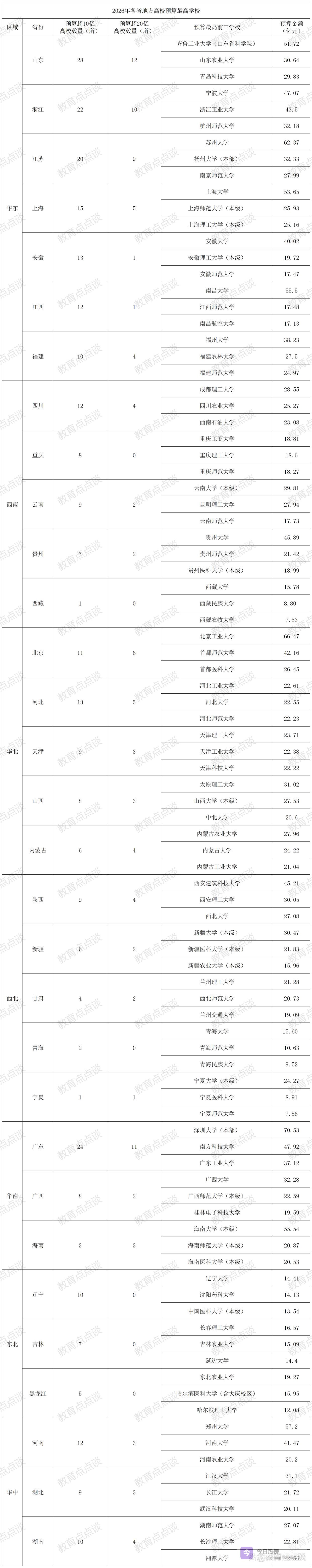 从整体来看,沿海地区和经济发达地区的地方高校预算很高,而东北地区的预算较低,没有地方高校预算超20亿,还有青海、西藏、重庆没有预算超过10亿的高校。