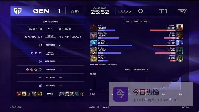 结果第一局比赛,T1仅在开赛时占据领先,但是到了比赛中期,就是GEN的天下了,而且GEN将比赛,打成了速胜局。比赛第9分钟,Kiin塞恩对位单杀Doran杰斯,两队前期一度互有来回;比赛第15分钟,GEN先锋团龙坑围攻一波打出1换4大胜,此后GEN开始占据主动;比赛第22分钟,T1上野先后强行开团,GEN反打0换4后拿下大龙;最终比赛第25分52秒,GEN抓掉Doran杰斯后顺势一波结束比赛。