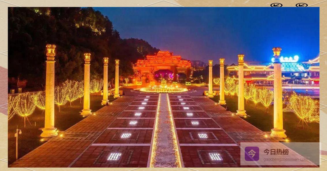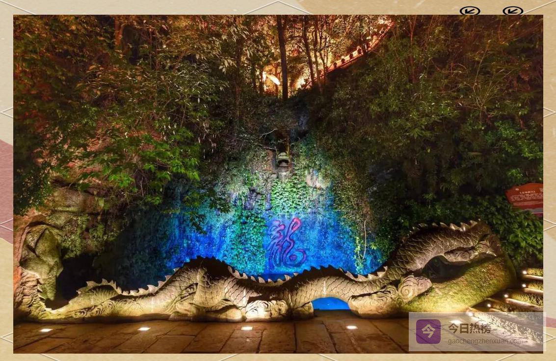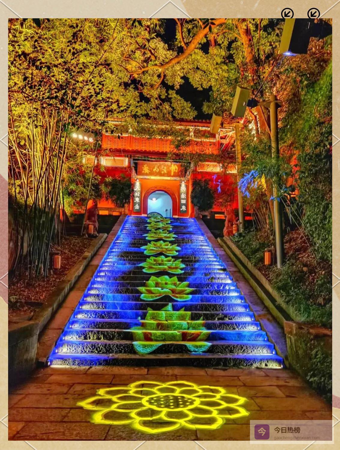 继续前行,遇见一排由莲花浮雕拼成的步道。灯光斜照,花瓣纹理被镶上金边,影子与实体交错,像一幅被风翻动的画卷。山林因此添了暖意,连空气都变得温柔。