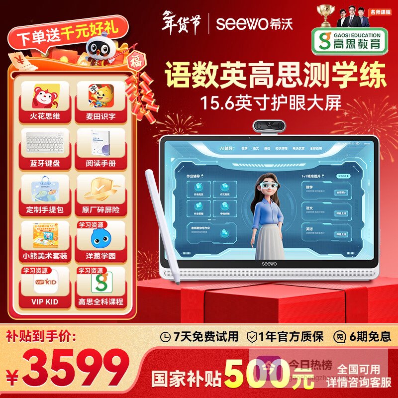 其特色在于与“高思教育”的合作,提供了系统的全科培优课程。国家补贴15%的政策也使其拥有不错的性价比。它定位为小学到高中的“学练机”,强调练习与巩固。对于需要大屏幕来保护视力、同时青睐体系化培优课程资源的家庭,希沃W20提供了一个大屏沉浸式的学习方案。