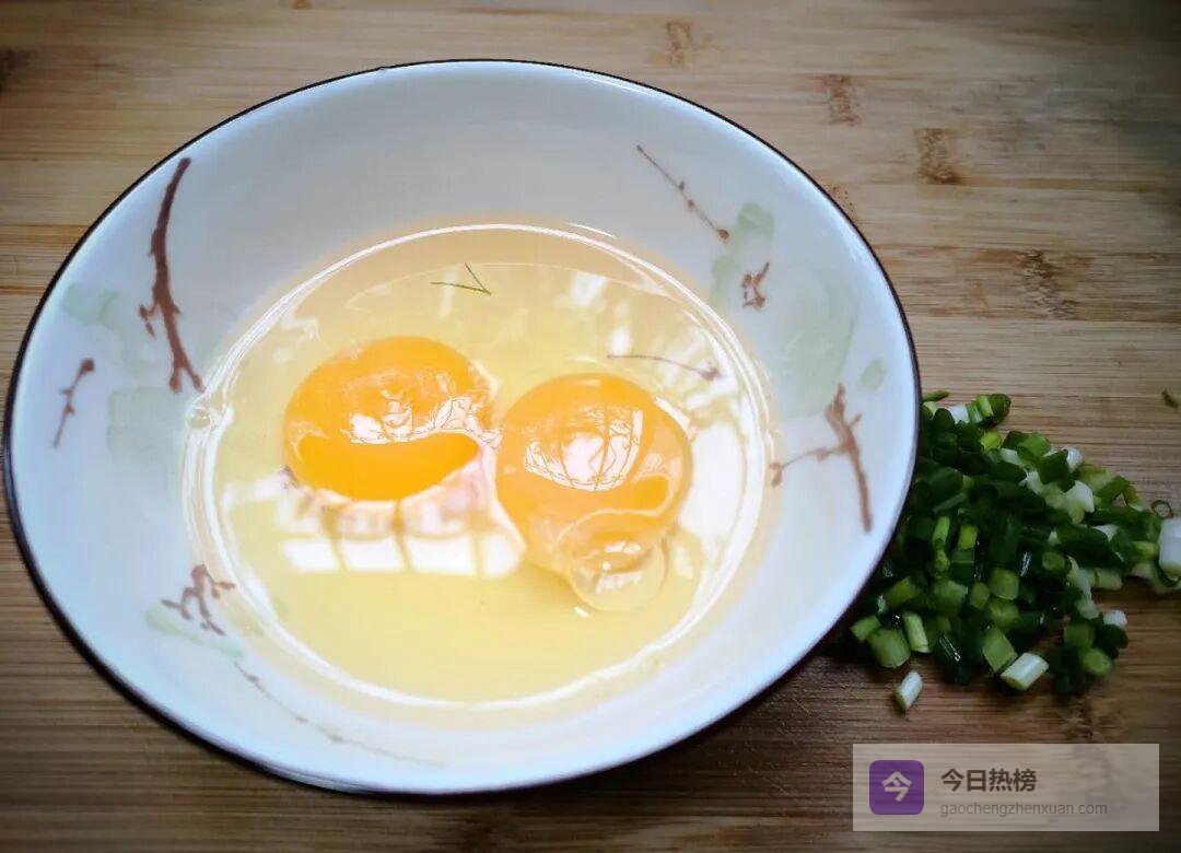 打蛋液:鸡蛋入碗,加少许盐,筷子顺同一方向搅到蛋液起泡,葱花切碎。