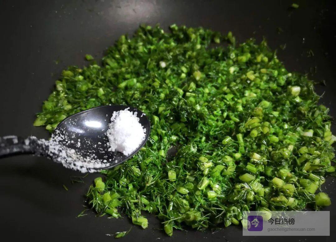 定型:茴香刚断生,表面撒盐翻匀,把蛋液均匀淋在菜面上,先别急着翻动。