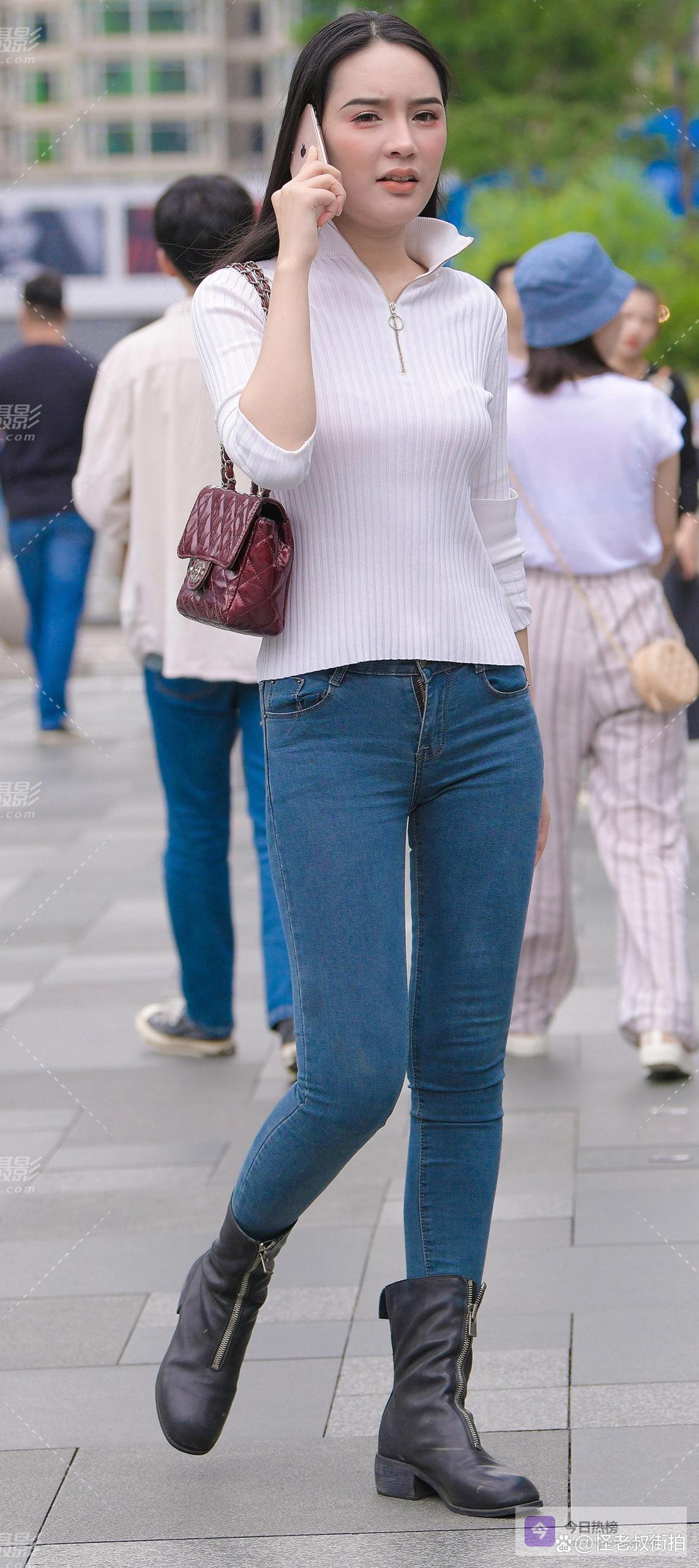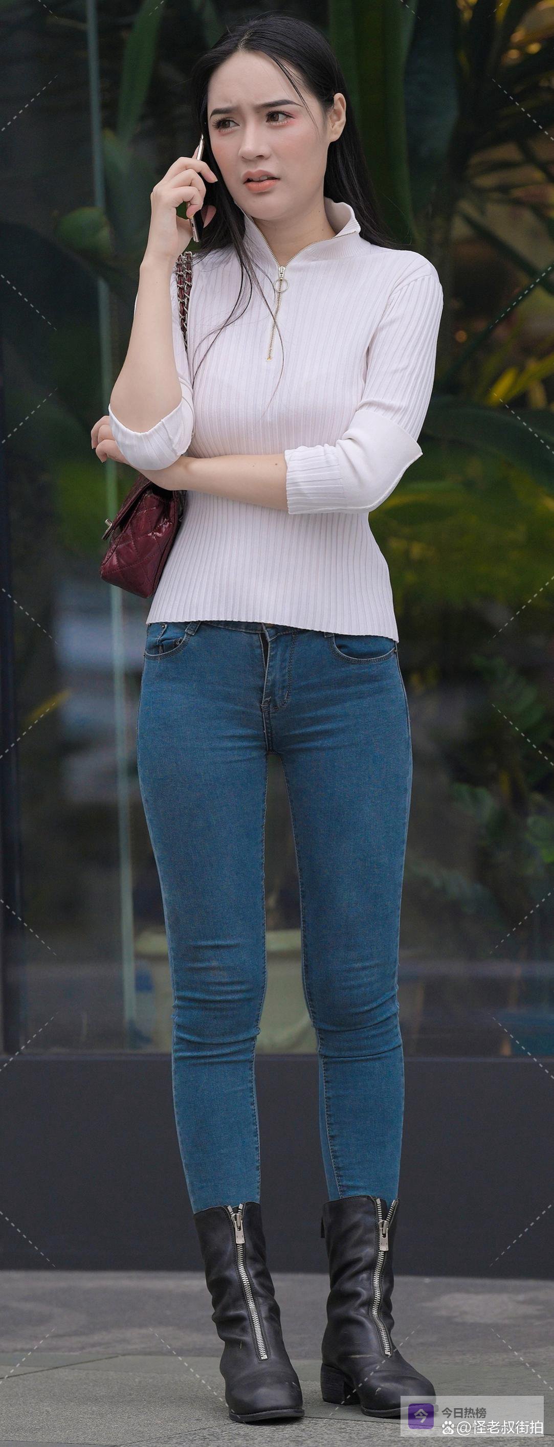 这条牛仔裤的蓝,必须是经典的“中蓝色”或略带怀旧感的“水洗蓝”。它褪去了深蓝的沉重,又比浅蓝多了一份稳重。小脚的剪裁紧紧包裹着腿部线条,将双腿修饰得笔直修长。它毫不掩饰地展示着身体的曲线美,与上半身宽松的针织衫形成了“上松下紧”的黄金法则。这种廓形的对比,不仅视觉上极度显瘦,更带来一种利落、干练的都市气息。裤脚处最好没有过多的堆积,刚好及踝的长度,是为了给那双黑色短靴留出完美的展示空间。
