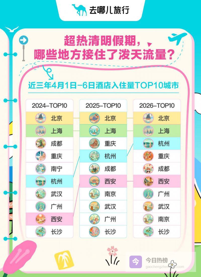 去哪儿平台数据显示,4月1日至6日酒店预订量最高的城市依次为北京、杭州、上海;木鸟民宿则把“最火榜单”留给北京、南京、青岛。受春假错峰影响,北京民宿订单量同比上涨32%,毫无悬念地蝉联清明家庭游第一目的地。