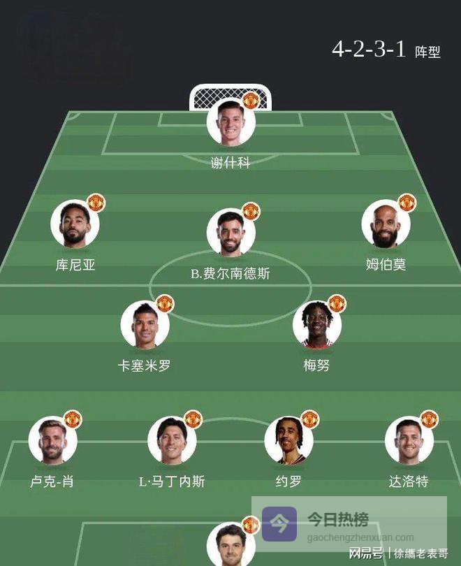 本场比赛曼联队内的伤病只有德里赫特和多古因伤缺阵,马奎尔红牌停赛也无法出场,预计曼联的首发阵容4231如下。