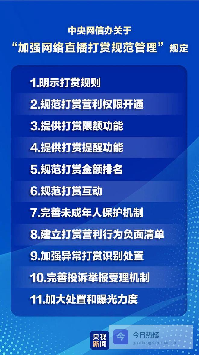 中央网信办发布《关于加强网络直播打赏规范管理的通知》。