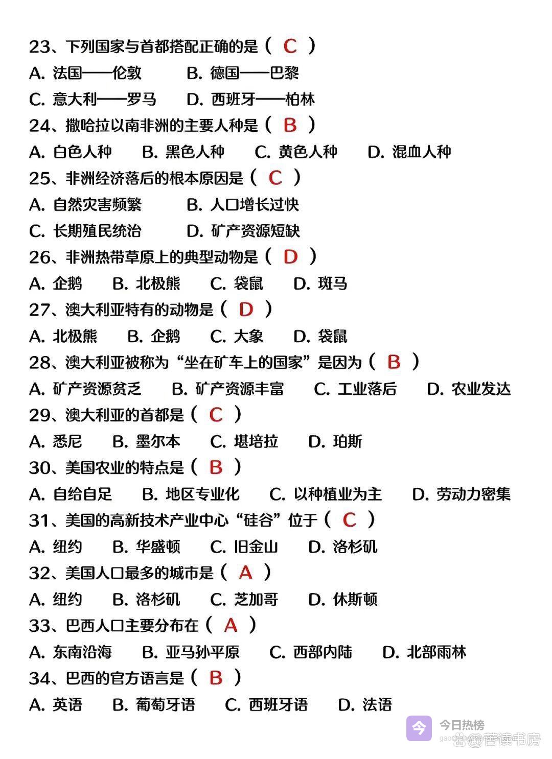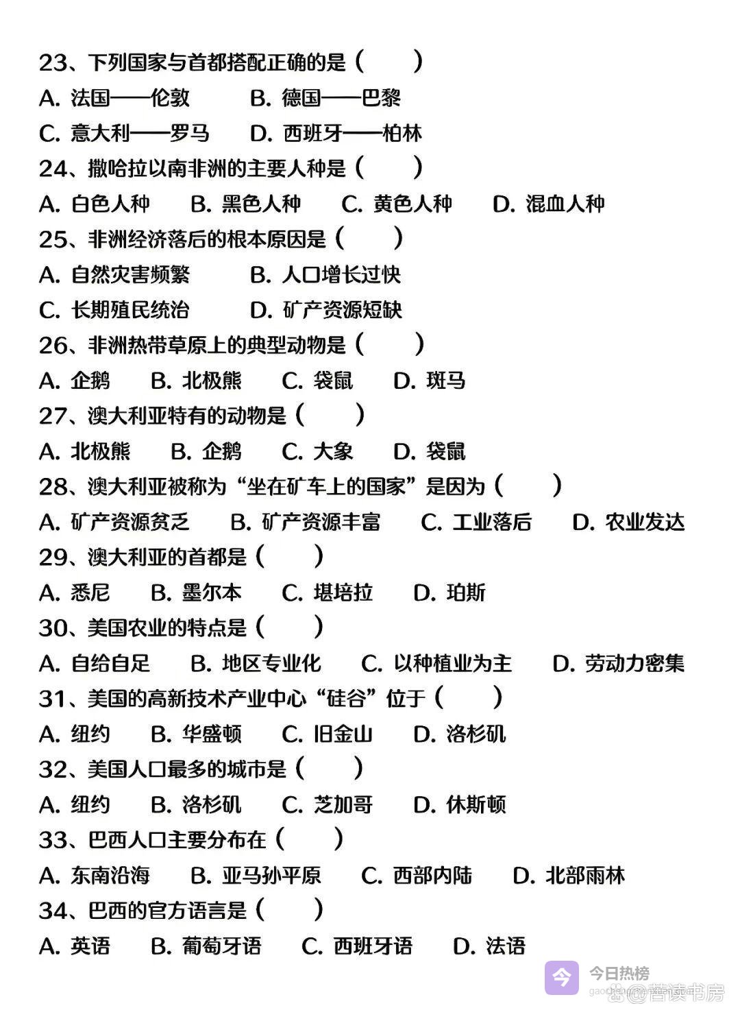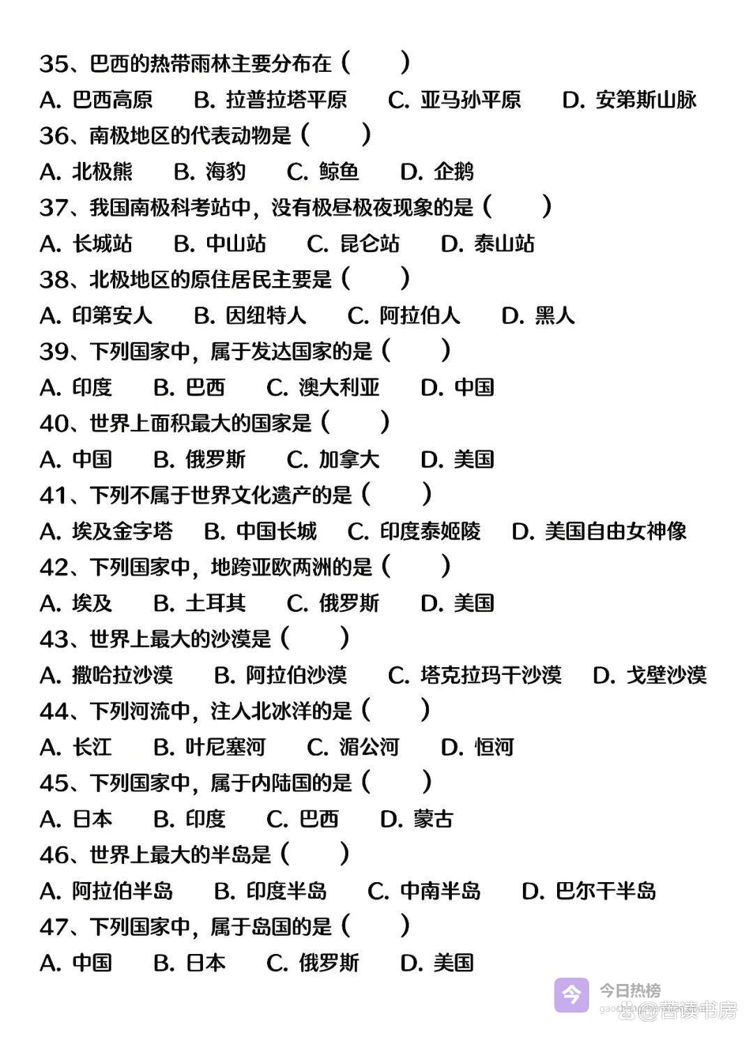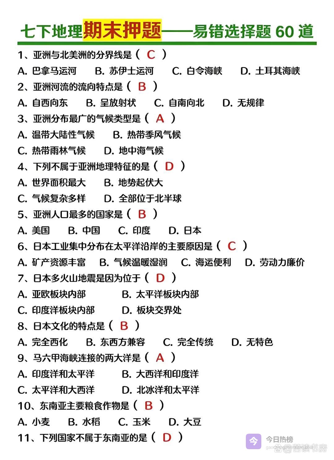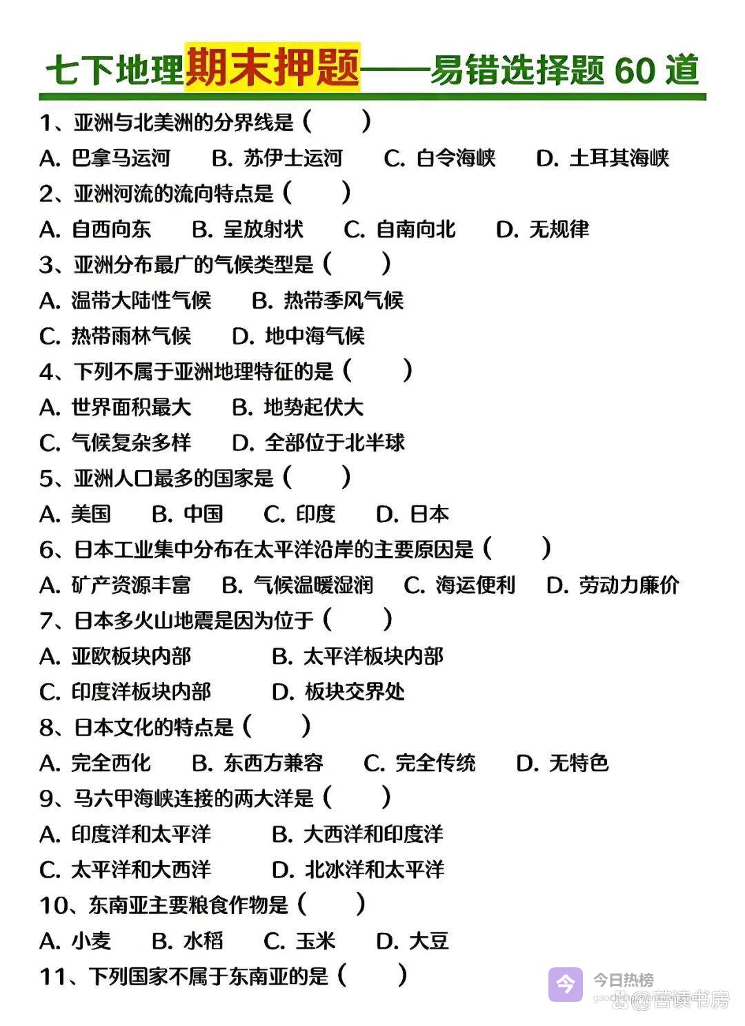 七年级下册地理聚焦世界区域地理,涵盖各大洲地理特征、国家地形气候、人文经济等知识点,知识点琐碎、易混淆,选择题更是考试中的失分重灾区。很多孩子看似掌握了基础内容,做题时却频频踩坑,要么混淆大洲气候分布、地形地势特点,要么记错国家物产、人文习俗,要么对经纬位置、地理成因判断失误,基础题丢分、易错题踩坑,地理成绩始终难以提升。想要轻松攻克选择题、稳住地理分数,这份60道易错选择题归纳,就是孩子查漏补缺、突破薄弱的必备资料,尖子生早已吃透练熟,建议家长赶紧收藏!
