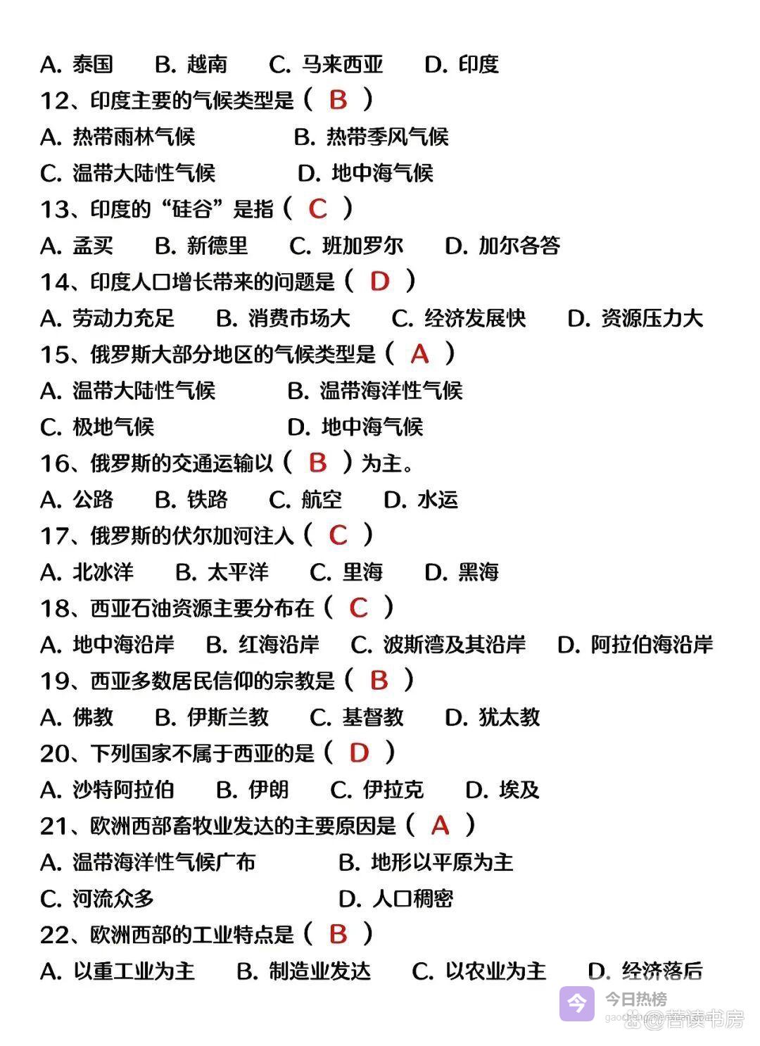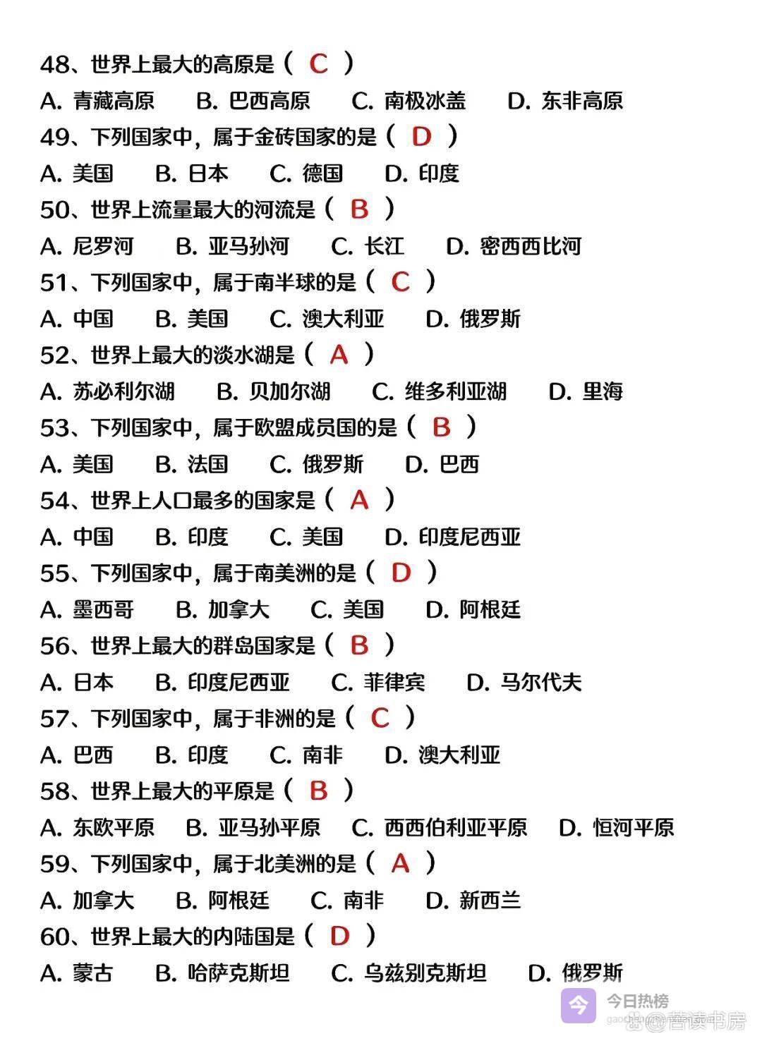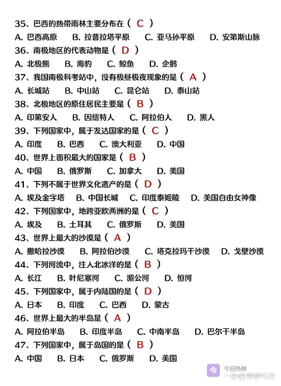 地理选择题失分,大多是孩子没理清地理要素关联、易混概念区分不清,做题时凭感觉作答,忽略题干关键信息。这份资料里的60道易错题,囊括概念辨析、特征判断、成因分析、区域对比等各类题型,把常考的易错陷阱一一罗列,比如亚洲气候分布误区、各国经济特点易混点、地形地势特征易错表述等,让孩子提前避开答题误区,练就精准审题、快速解题的能力,彻底告别“一做就错”的困扰。