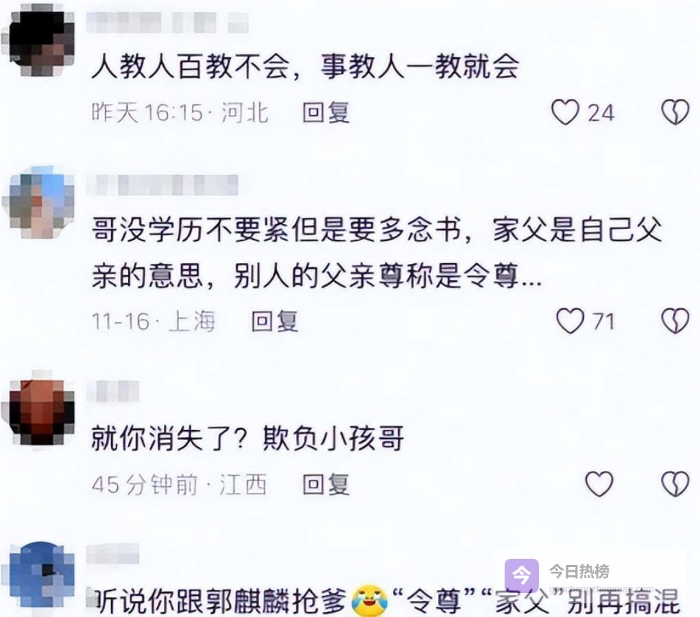 他接着又提到“多带父亲一起来参加电影活动,提高一下评分”,言下之意就是在暗示郭麒麟的成功全靠自己爹一路护着、撑着。