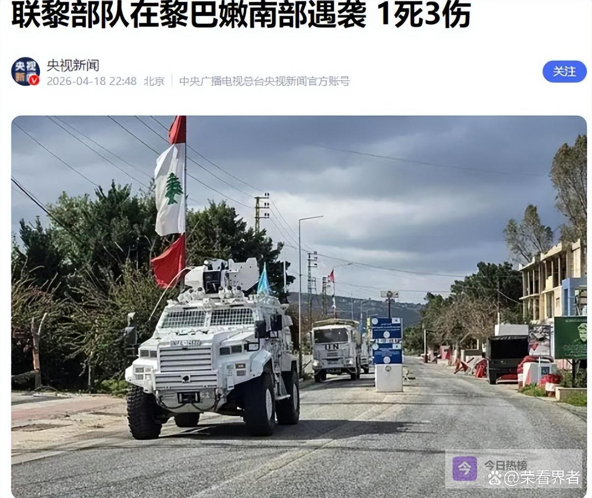 中国、意大利、印尼、法国,这些国家的士兵日复一日在雷区排爆、在村庄巡逻,不拿任何一方的枪,只守住一条脆弱的和平底线。可2026年以来,针对联黎部队的袭击已多达17起,含3起致命袭击——3月21日一起,4月5日一起,4月18日又是一起。说是"和平守护者",倒不如说是被困在两方炮火夹缝里的高危群体,每一次出门巡逻都是在赌命。