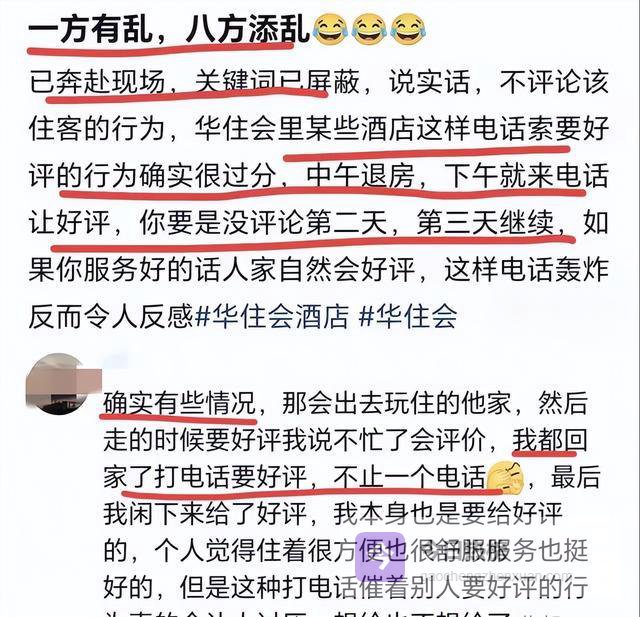 不过这件事也顺带扯出了酒店行业的一个普遍乱象,不少华住会的离职员工和在职员工纷纷站出来爆料。原来华住会总部强制要求门店,每天下午必须给当天退房的客人打回访电话,还要完成一定数量的全优好评指标,完不成就开会施压、扣绩效,很多员工就是因为受不了这种电话轰炸式要好评,才选择辞职。不少住客也吐槽,本来住得挺满意,结果退房后天天被电话追着要好评,反而弄得一肚子火,好好的服务变了味,严重打扰日常生活。