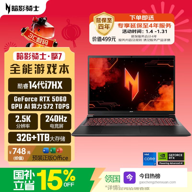 【京东自营】宏碁暗影骑士擎7国家补贴16英寸游戏本笔记本电脑酷睿14代i7-14650HX32G1T¥