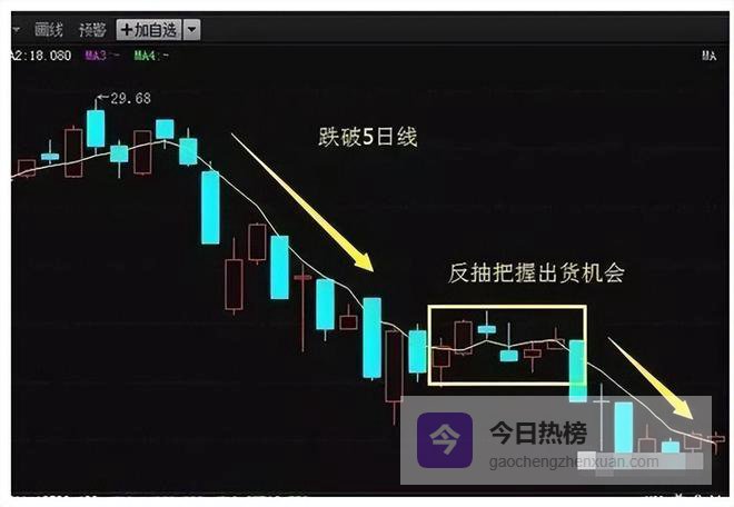 3、股价如果跌破了5日线,反抽5日线过不去的话,就需要谨防追高被套,注意逢高卖出。如果是在熊市,股价如果升破5日线,反抽5日线的时候跌不破的话,或反抽5日线跌破但是又止住时,需要谨防杀跌踏空,注意逢低买回。如下图:
