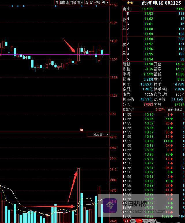 如果具备以上条件说明,大阳线的当天是主力的主要成本区,而且在高位放量,证明主力成本较高。那么我们可以大概在集中放量的价位画一个线,如示例图的紫色线,这根线就是主力的成本线。一般操盘手不怎么喜欢自己账面浮亏,所以一般会在收盘前把价位拉回去。