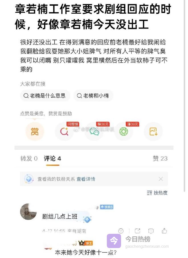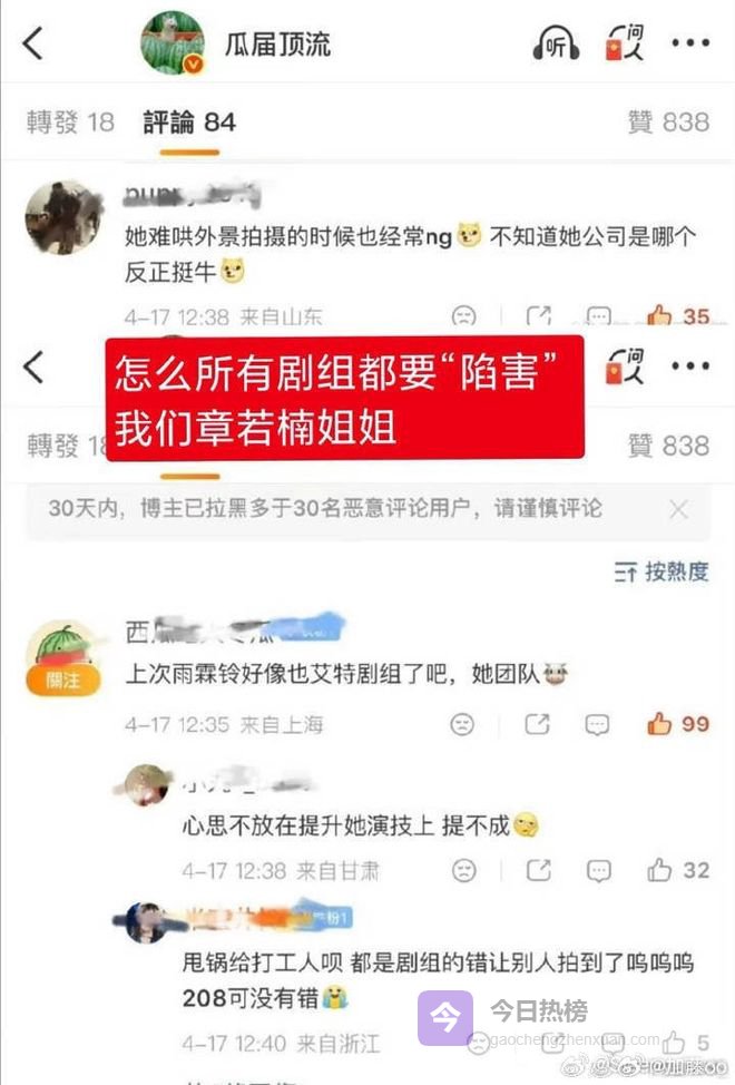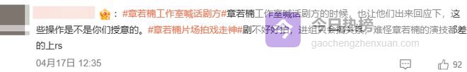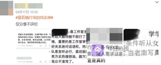 跟#章若楠片场拍戏走神# 一起上热搜的,还有知情网友爆料,说是章若楠在片场多次NG,“321一下午了”,导致剧组拖延收工。