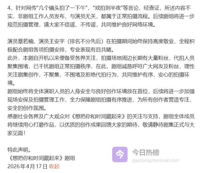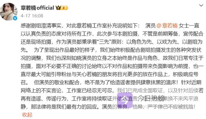随后章若楠工作室转发了声明,感谢剧组澄清事实的同时,强调章若楠对待创作始终认真负责,团队已针对不实言论完成全面取证,后续如果再有造谣传谣行为会持续跟踪、依法追责。