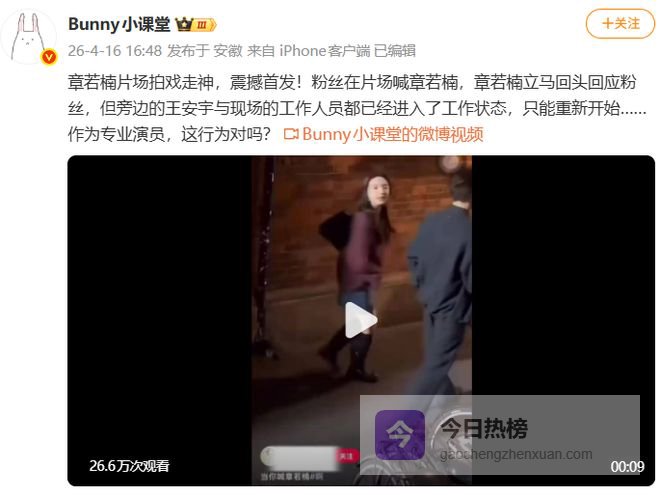 那路透视频只有几秒,是在剧组拍戏现场,有人喊了声“章若楠”,她立刻回头回应,此时旁边的王安宇已经入戏了,章若楠反应过来,赶紧提醒他回来,拍摄也因此中断。