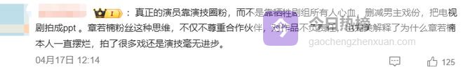 “章若楠粉丝这种思维,不仅不尊重合作伙伴,对作品不负责任,也完美解释了为什么章若楠本人一直摆烂,拍了很多戏还是演技毫无进步”。