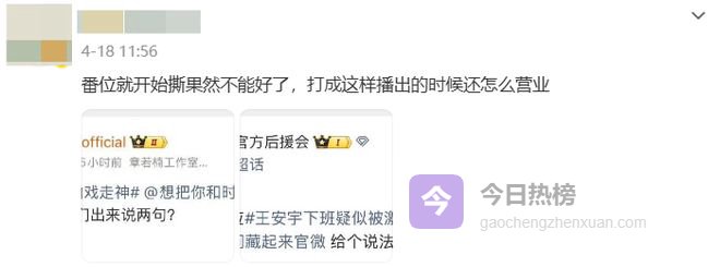 因为有过类似的先例,也有网友猜章若楠和王安宇这波,是不是“演员和剧方商量好的,拿这个炒热度罢了”、“一部剧只有播之前热闹”、“两边炒就行了,反正横竖都是热度,播得不好就往这件事赖”。