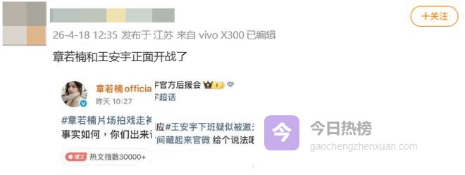 王安宇粉丝也反击对方造谣,说首发视频的并不是自家粉丝,而且章若楠不够专业是事实,被喊名字之前都已经开始走戏了,她还在东张西望,一喊就回头更是影响剧组进度、拖王安宇后腿。
