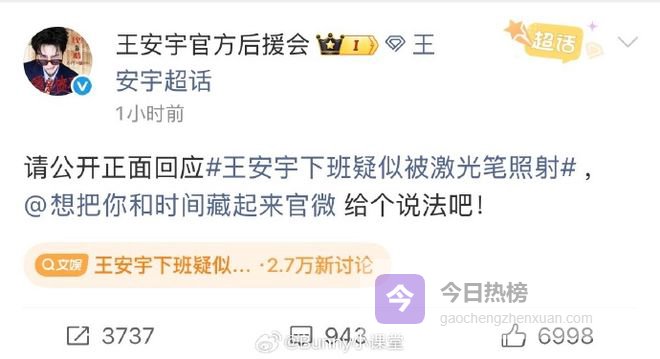 王安宇下班路上被人用激光笔照了眼睛,追线下的粉丝也跟着爆料,说王安宇出现之前,就有人在拿着激光笔乱晃,从粉丝到艺人都跟着遭殃。