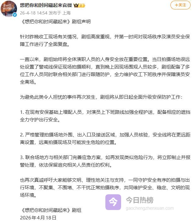 剧组倒是也火速回应了,表示会从即日起全面升级安保防护工作,在现有基础上增配人员、全程护送演员上下班、配备相应遮挡、严格管理拍摄场地、加强人员核验、再发现类似危险,将立即制止并报警处理。