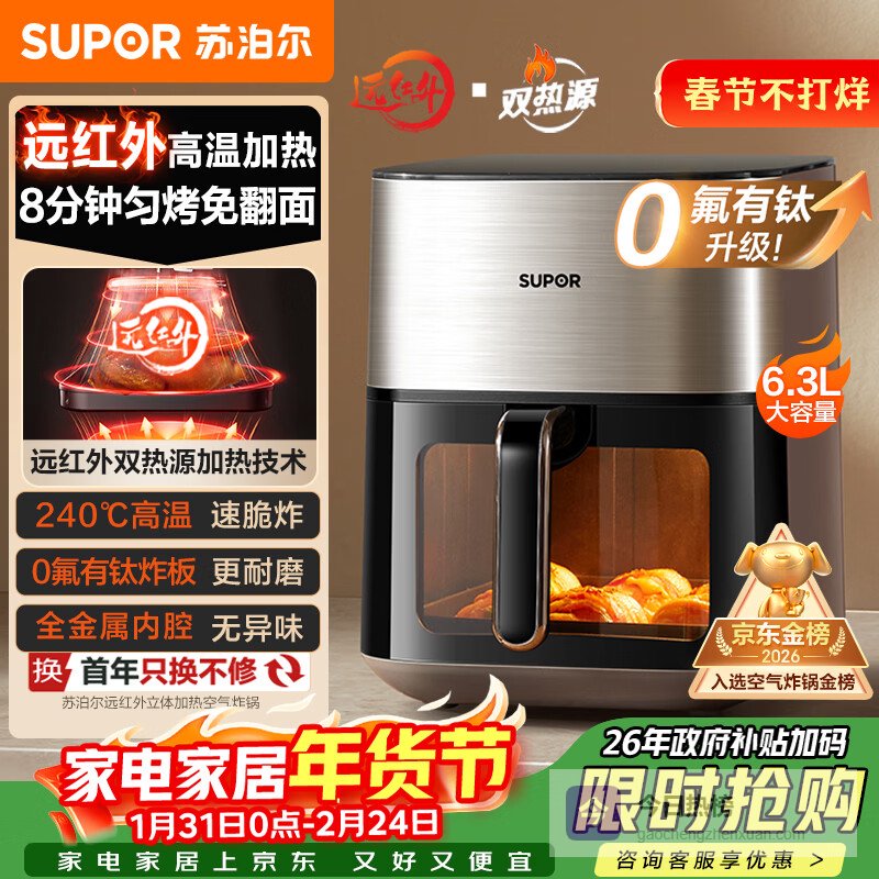 苏泊尔(SUPOR)空气炸锅远红外穿透加热家用6.3L大容量不用翻面薯条机双热源蒸汽嫩炸多功能电炸锅 KD60Y883¥