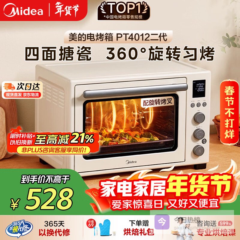美的(Midea)多功能风炉电烤箱家用 空气炸锅烤箱一体机/40L大容量/四面搪瓷/热风循环/PT4012W二代¥