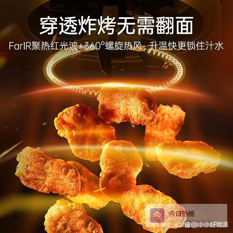 ▶无需翻面,轻松烤透:采用新一代「FarIR聚热红光波」,红光波瞬时穿透食材,搭配360°螺旋热风,大块食材轻松烤透,告别繁琐翻面过程,省时省心,烤出完美口感,尽享美食乐趣。