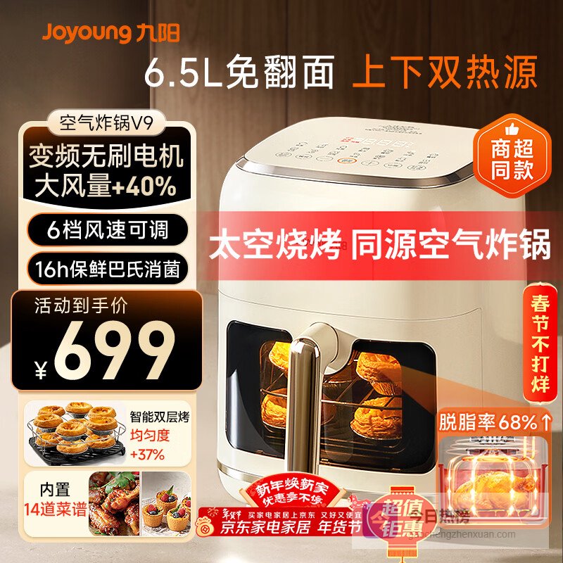 ▶脱脂率提升68%,健康享美食:九阳KL65-V9空气炸锅,采用变频脱脂技术,脱脂率高达68%,让你在享受美食的同时,也能关注健康。