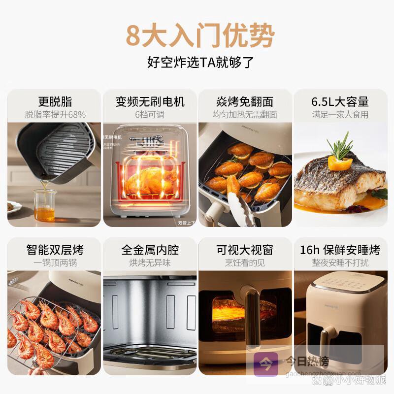 九阳在厨房小家电领域的地位,那真是没得说,用户基础非常大。他们做空气炸锅,也把在豆浆机、破壁机上积累的加热和搅拌技术用了一些过来。产品线丰富到眼花缭乱,从最基础的机械旋钮款,到能蒸汽嫩烤、可视化、甚至不用翻面的高端款,你总能找到一款。