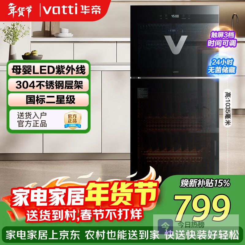 对于小户型家庭或特别关注母婴安全的用户来说,这款华帝立式消毒柜提供了一个非常精致的解决方案。它主打“小型”、“不锈钢”和“母婴适用”,体积紧凑,能够轻松嵌入橱柜或置于台面,不占用过多厨房空间。其核心消毒方式是紫外线结合高温,双层设计能够分区存放,上层适合为宝宝的奶瓶、奶嘴、餐具进行紫外线消毒,避免高温导致塑料制品变形或释放有害物质;下层则可对不锈钢碗筷、陶瓷餐具进行高温消毒,实现全面防护。内胆采用304不锈钢,耐用且易于擦拭清洁。这款产品的定位非常清晰,就是为追求生活品质、有明确分区消毒需求的现代小家庭,尤其是婴幼儿家庭设计,功能直接,操作简便,是入门级家用市场中的口碑之选。