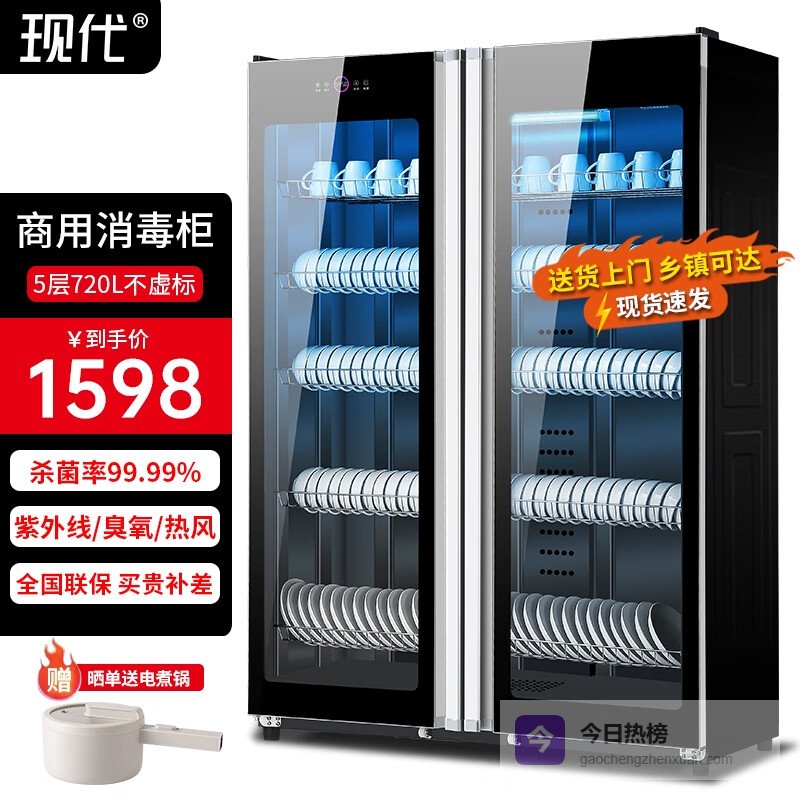 同样是面向商用市场,现代这款消毒柜提供了一个略有不同的侧重点。其最显著的特征是“115cm宽”的机身,这意味着它拥有更宽敞的单层空间,能够轻松容纳大型托盘、鱼碟、异形餐具或成批的杯子,对于宴会厅、中西餐厅、火锅店等需要处理大量且多样餐具的场所尤其友好。在消毒技术上,它同样配备了紫外线、臭氧以及热风循环系统。热风循环功能能够使柜内温度更均匀,提升烘干效率,确保无潮湿死角。这款产品可以看作是专为处理“大件”和“多样件”餐具的商用场景所优化,在保证消毒效果的同时,突出了空间容纳的灵活性和高效烘干能力。