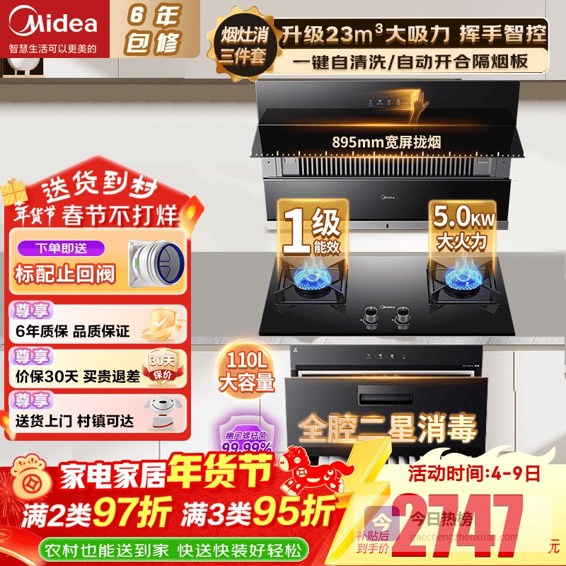 美的(Midea)抽油烟机家用烟灶套装侧吸式烟机灶具热水器三件套23大吸力厨房油烟机套装三件套J39 三件套【搭5.0kw猛火灶+110L消毒柜】天然气 智能家电¥
