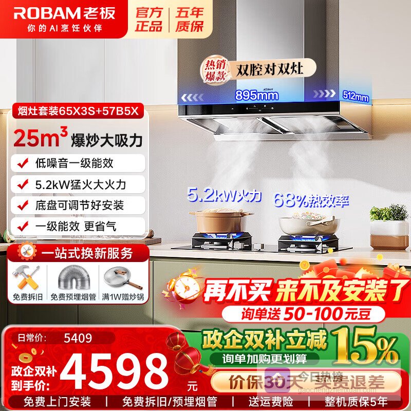 老板(Robam)【双子星65X3S】油烟机灶具套装 欧式双腔25风量1000Pa静压 挥手智控变频大吸力抽油烟机烟灶套装 【烟灶套装】65X3S+57B5X三维速火¥
