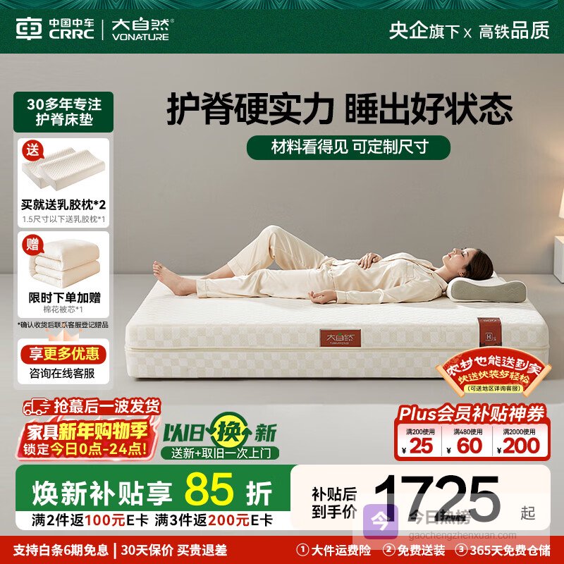 5、大自然山棕床垫A5椰棕/山棕床垫用料讲究,天然植物纤维加上高温热压技术,环保又安心。再也不用担心睡不好啦,它能提供给你偏硬的支撑,呵护你的脊椎,而且纤维结构还能吸收噪音,翻身再也不怕吵到枕边人啦!