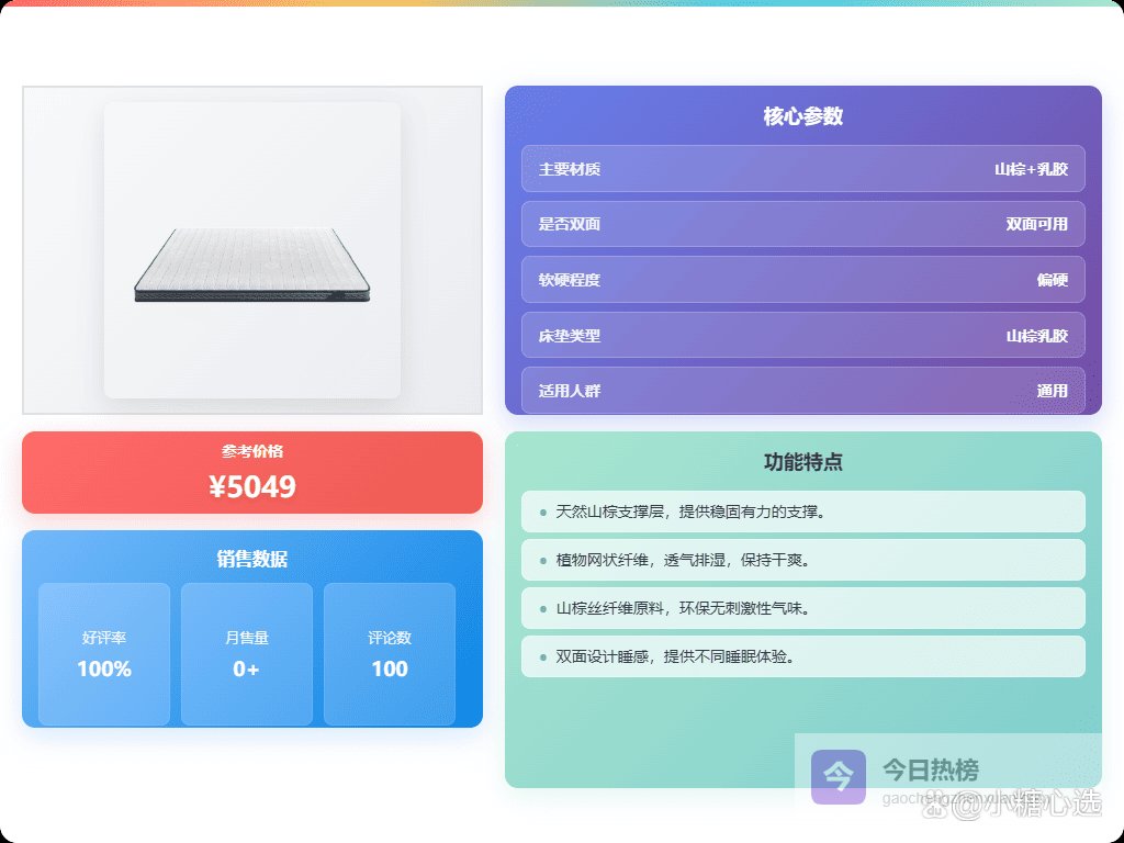 5、慕思山棕乳胶床垫这款慕思床垫,亮点在于它的双面设计,一面偏硬,一面未知(根据提供的信息无法得知)。内部结构也挺讲究,5cm的天然山棕提供扎实支撑,上面再铺3cm的天然乳胶来缓冲,软硬结合,睡起来应该挺有意思。而且用料实在,精选云贵高原的山棕,纤维粗长韧性好,感觉能提供不错的承托力。