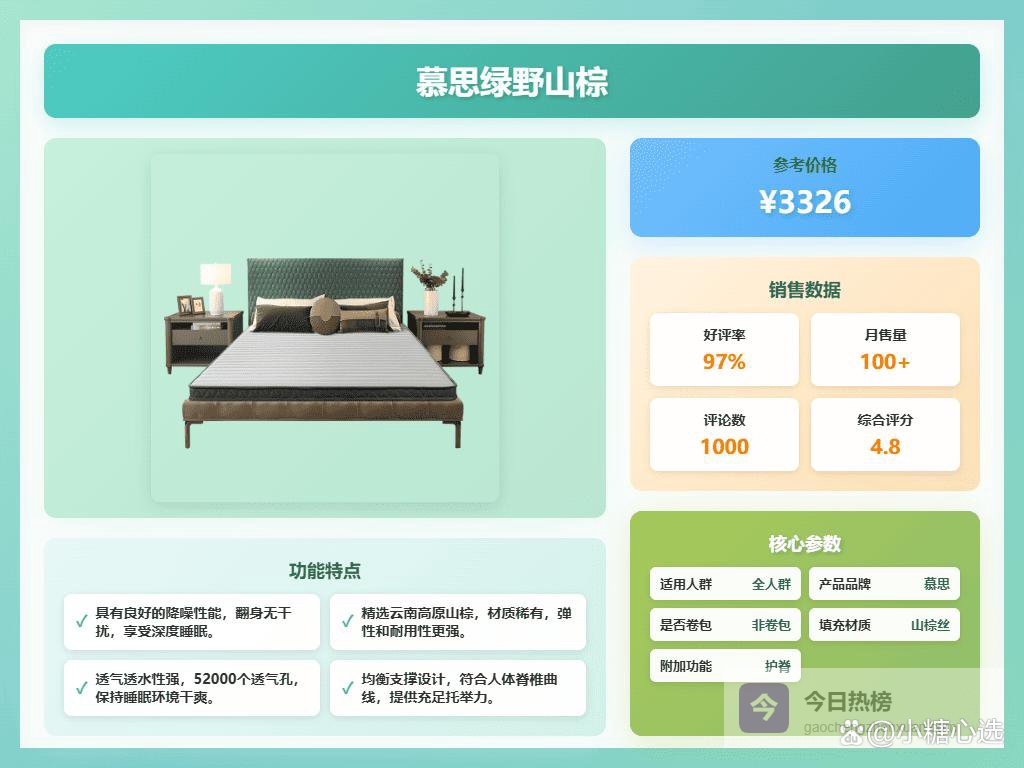 当然,除了品牌理念,做工质量和使用体验也很重要。从提供的产品信息来看,慕思的山棕床垫在细节处理上更精致一些,比如弧形拐角设计,以及面料的舒适度。 而大自然的山棕床垫则在透气性上表现更出色,这得益于其独特的山棕纤维结构。两者的相似之处在于,都非常注重支撑性和护脊功能,毕竟这是山棕床垫最核心的优势。 那么,究竟该如何选择呢?