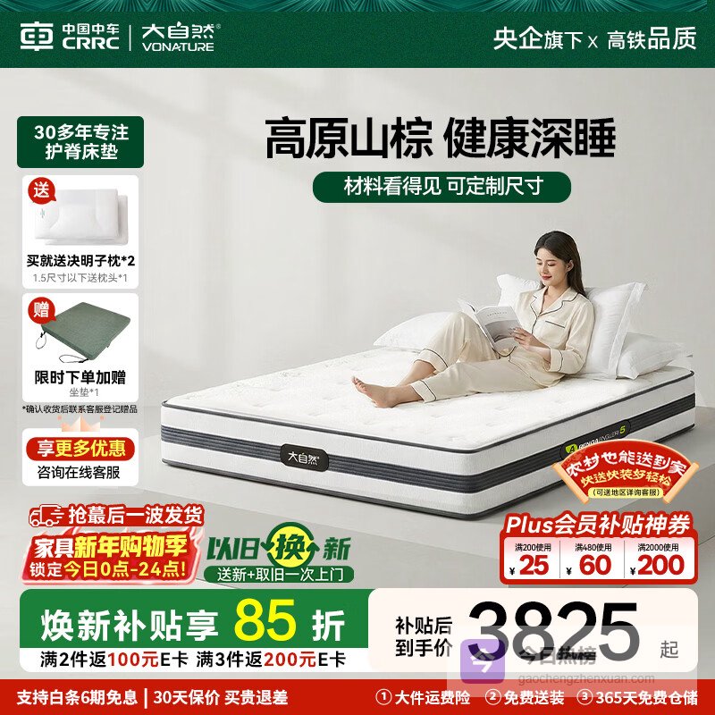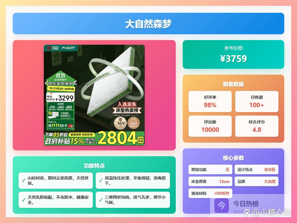 3、大自然森梦这款大自然山棕床垫,主打的就是一个天然环保和舒适透气。它采用云贵高原的山棕板丝,并且用天然乳胶粘合,据说还通过了高温热压处理,睡起来更安心。而且,这种山棕板丝本身就有透气孔,能帮助调节睡眠时候的温度和湿度,舒适度提升了不少呢!