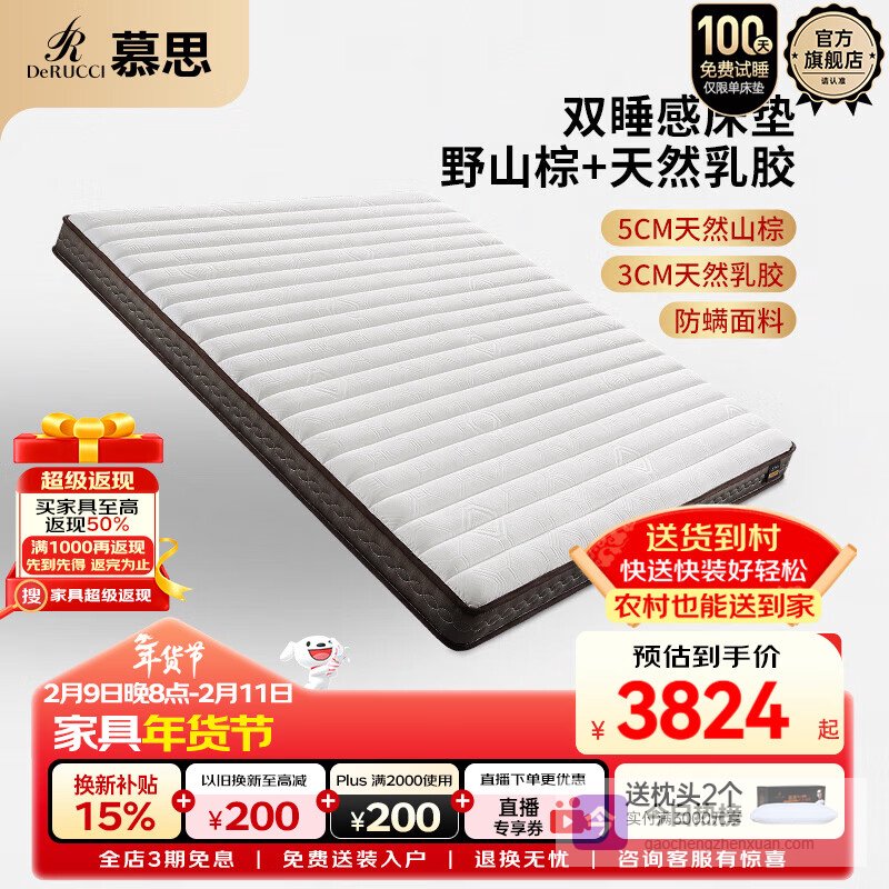 慕思(de RUCCI)山棕乳胶床垫天然偏硬托脊薄垫防螨面料双面睡感 1.8*2米 偏硬¥