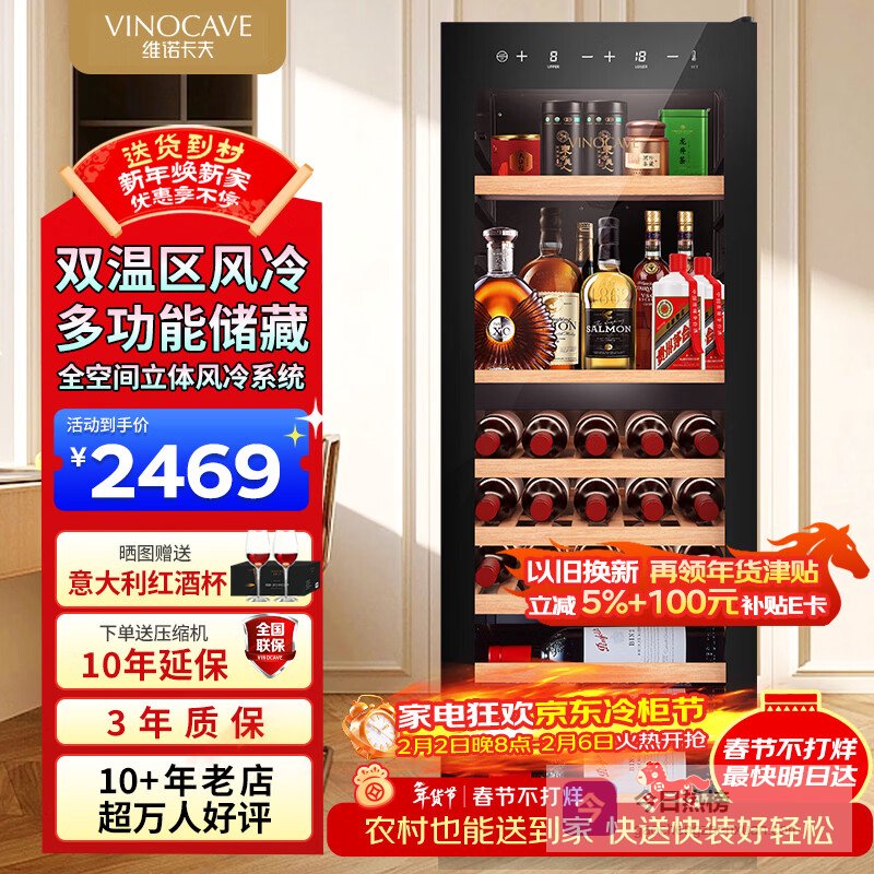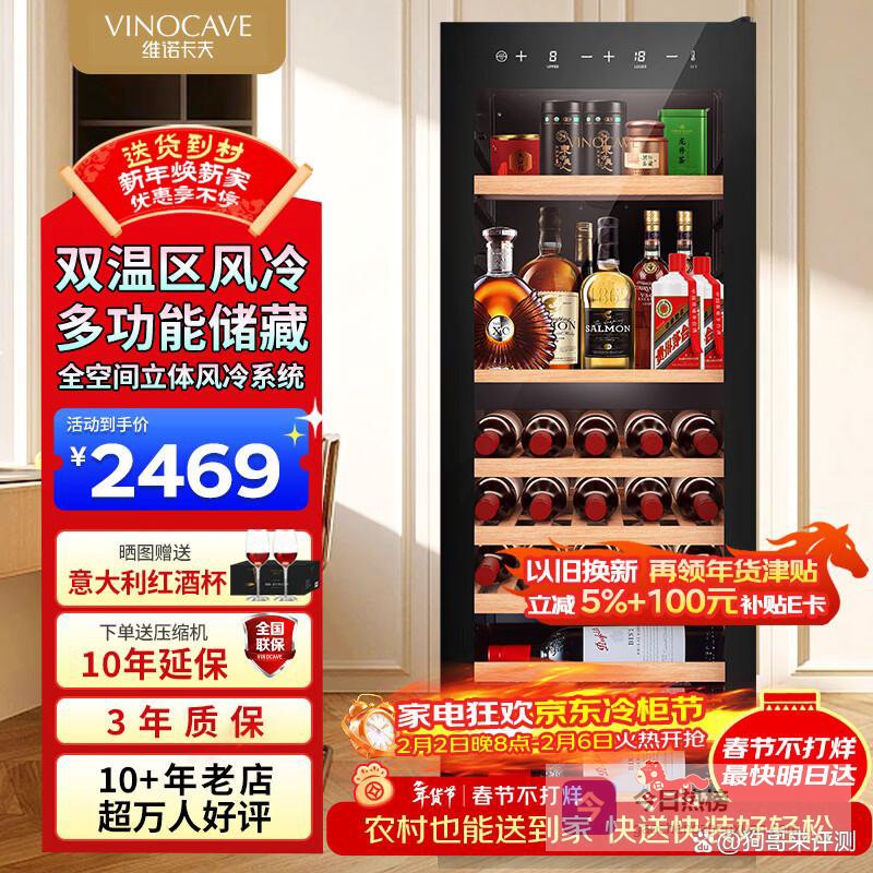 这里不得不夸夸它的风冷制冷方式,不仅制冷速度快,还不会结霜。想想以前那种老式的冰柜,隔一段时间就要忙着除霜,麻烦得很。这个维诺卡夫酒柜就完全没这烦恼,让你省心又省力👍。而且它还有保湿功能,就像一个贴心的小管家,时刻守护着酒的“健康”。家里要是有一些珍贵的茶叶,也能放在这里保存,不用担心受潮变质。它的箱门是镀膜玻璃,即时尚又能减少光线对酒的影响。采用侧开门的设计,拿取酒品超级方便,就冲这设计,闭着眼入都不亏👏。