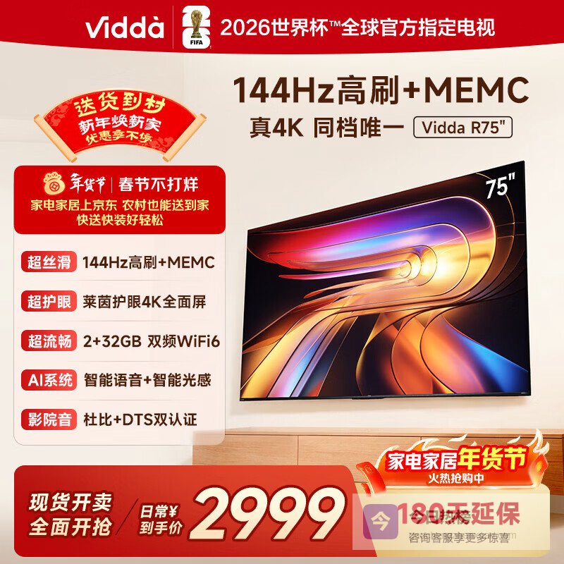 Vidda海信电视75英寸 R75 一级能效 144Hz高刷 2+32G 换新家电国家补贴液晶游戏电视75V1Q-R¥