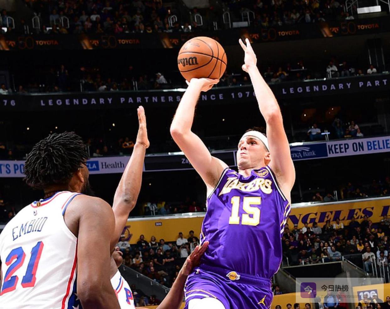 决定胜负的第四节,完全变成了“里夫斯时间”。 他一开场就借艾顿的扎实掩护,在右侧45度角张手命中三分,帮助湖人自第一节以来首次取得领先。 下一个回合,76人防守沟通失误,里夫斯在完全相同的点位再次获得空位,他毫不犹豫,手起刀落,又一记三分穿网而过。 随后他强硬突破造成杀伤,两罚全中。 个人连取8分,湖人一波8比0,以93比87反超6分,76人被迫暂停。 暂停回来后,76人的反扑由马克西和恩比德主导,他们一度将分差缩小到4分。 但湖人的外线此时已经投开了,斯马特在底角接到里夫斯的突分传球,命中本场个人第一记三分。 紧接着,里夫斯自己运球过半场,距离三分线还有两步远,在比赛时间即将走完、进攻时间还剩3秒时,他迎着扑防的马克西,超远距离三分出手,篮球划出一道极高的弧线,空心入网! 分差来到13分,整个球馆陷入了疯狂。