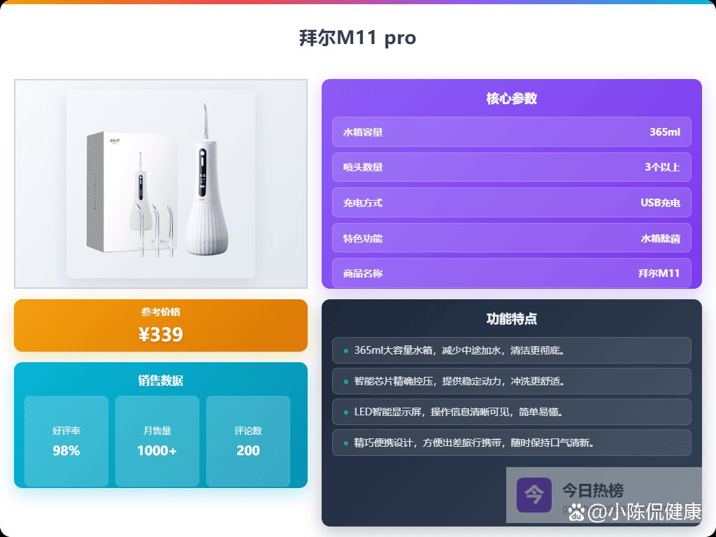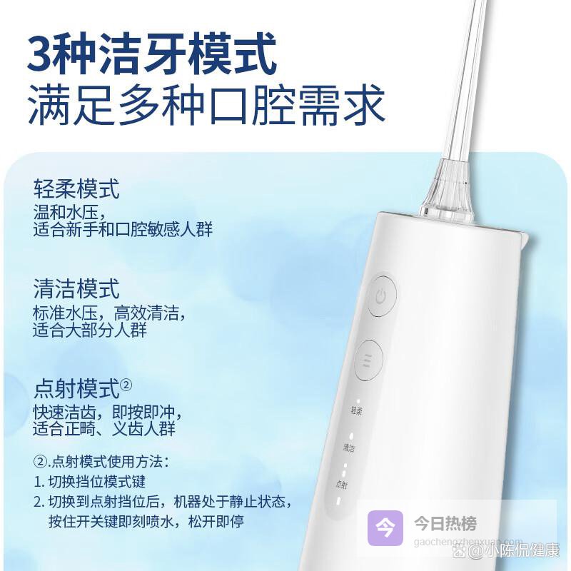 现在市面上做冲牙器的品牌挺多的,像博皓、拜尔、松下这些都挺常见的。价格方面,从一百多到几百不等,主要看功能和品牌。一般来说,大品牌的冲牙器在技术和售后服务上会更有保障一些,但价格也会相对贵一点。其实大家可以根据自己的预算和需求来选择,不一定非要追求最贵的。接下来,我们会结合上面说的这些选购要点,精选3款不同价位段、各有特色的冲牙器,给大家做个详细的对比和推荐。