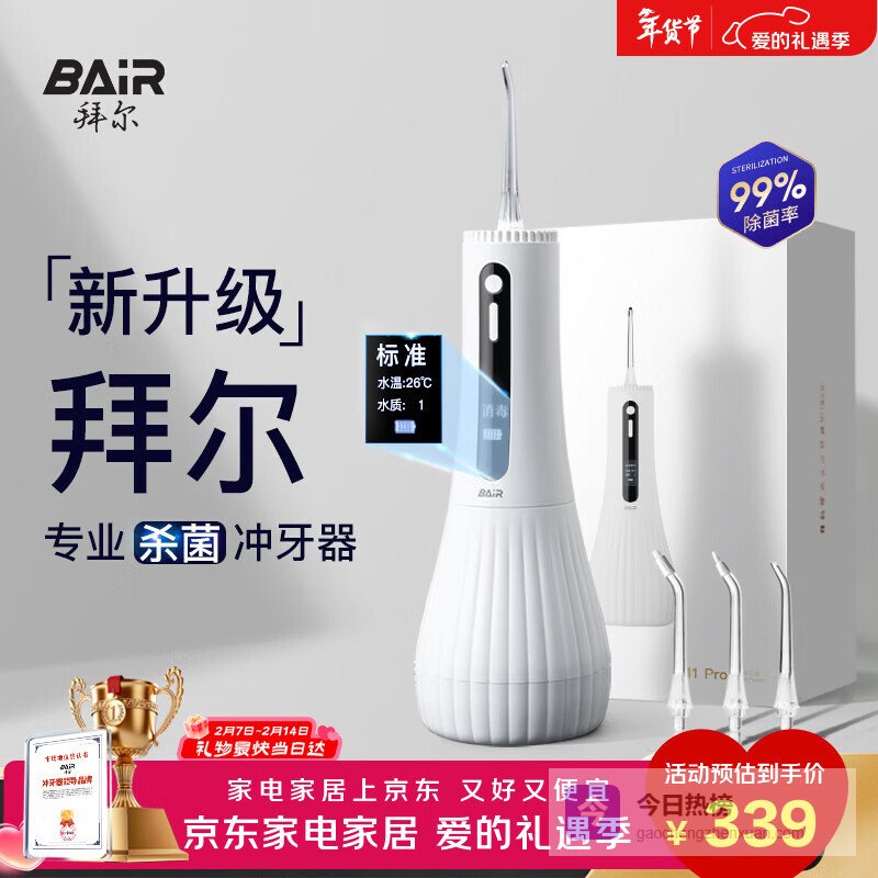 拜尔M11 pro 智能杀菌电动冲牙器 专业LED智显水牙线大水箱家用正畸洗牙神器礼盒 升级款 情人节礼物¥