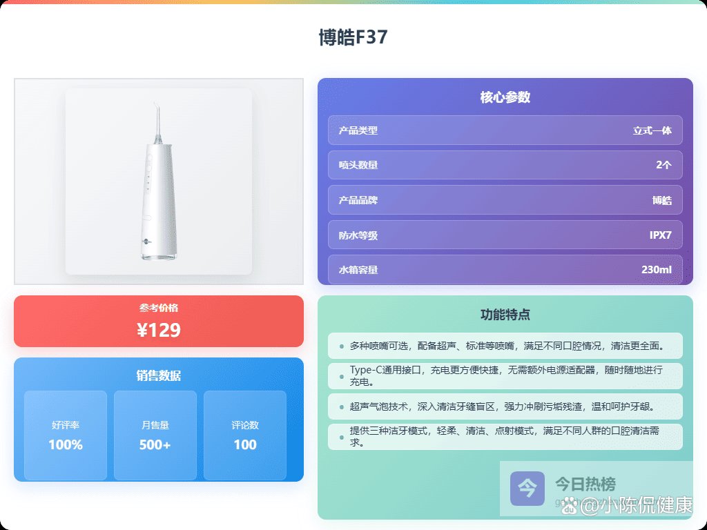 如果牙齿比较敏感,注重清洁的舒适度:博皓F37的3秒水压渐强功能和超声微气泡技术会比较适合你。